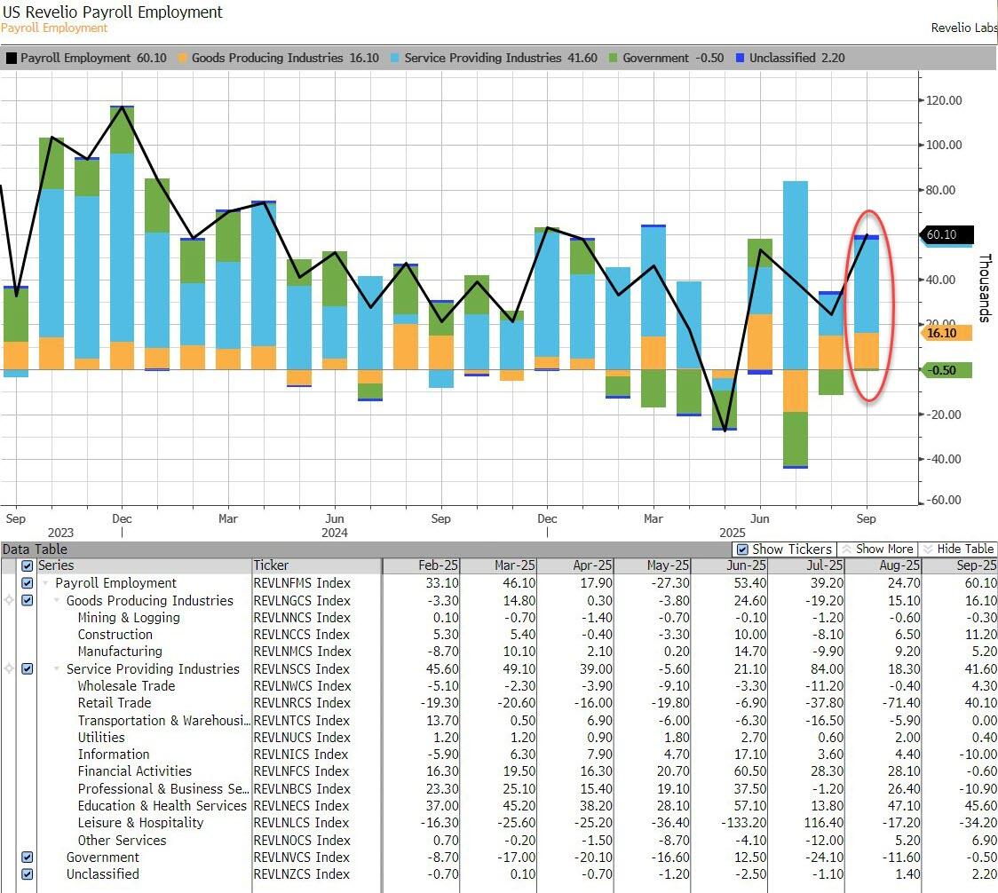 美国政府关门导致劳工统计局暂停发布非农就业数据之际,私人数据提供商Revelio Labs报告(RPLS)显示,9月份美国新增就业岗位6万个,为2025年最佳。这一数据远超此前ADP报告的负3.2万个岗位流失,有效缓解了市场对劳动力衰退的担忧。