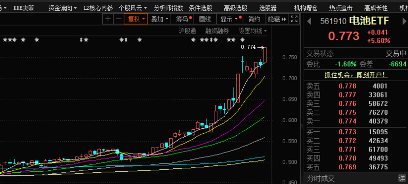 电池板块也因此大幅拉升。中一科技、天宏锂电、力佳科技、亿纬锂能、德瑞锂电等皆强势上涨,电池ETF一度涨超5%。