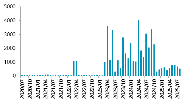 新能源产业链条来看,2025年1-8月,终端新能源汽车产量维持37%的高速增长;三元动力电池装车量-9.7%的负增长,主要原因是三元动力电池装车量在总动力电池装车量的占比持续维持20%以下的低位;三元正极材料产量以及新能源耗镍量增速持续修复,目前三元正极材料产量维持正增长,新能源对硫酸镍需求仍维持负增长。所以我们维持年初对新能源耗镍同比增速持平的预估。